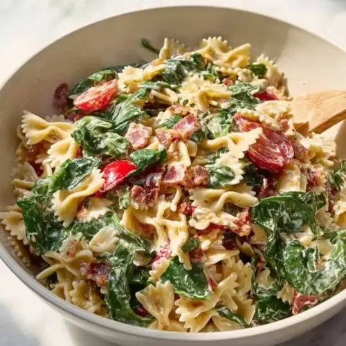 With each bite, you experience a delightful contrast of textures: the crunch of the lettuce, the pop of juicy tomatoes, and the satisfying chew of perfectly cooked pasta. The flavor harmoniously intertwines, giving you that unmistakable taste of a BLT but in a refreshing salad form. This dish is perfect for summer picnics, potlucks, or even just a cozy weeknight dinner.