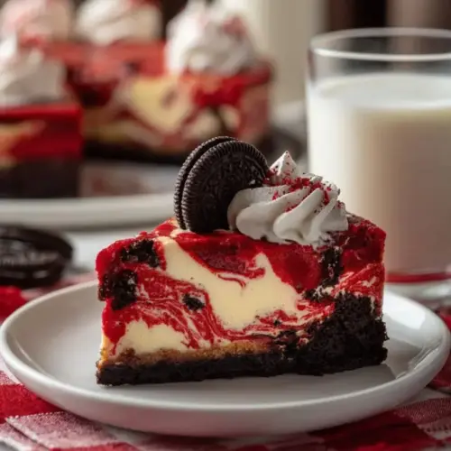 The decadent red velvet cheesecake is uniquely characterized by its smooth, rich texture that melts in your mouth, and the subtle hint of cocoa flavor that’s both comforting and festive. When served with festive garnishes like mini Oreos and bright Christmas sprinkles, it also becomes a stunning centerpiece for any holiday dessert table. This cheesecake is perfect for holiday gatherings, Christmas parties, or simply to enjoy with loved ones during cozy winter nights.