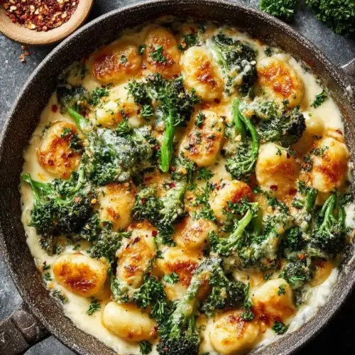 A comforting one-pan wonder with soft gnocchi and vibrant broccoli in a creamy, cheesy sauce, ready in under 30 minutes.