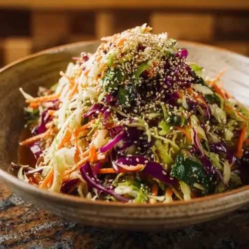 A vibrant and irresistible twist on a classic slaw with crunchy textures and a delightful sesame dressing.