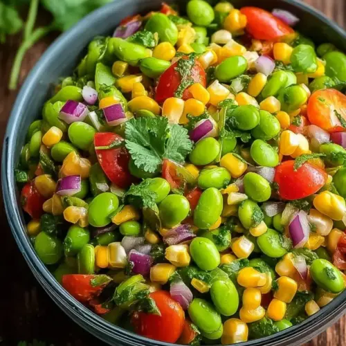 A vibrant salad featuring edamame, corn, and a zesty lime dressing that enhances its fresh flavors, perfect for any occasion.