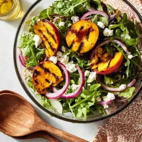 What makes this salad truly special is the combination of flavors and textures that dance on your palate. The warmth from the grilled peaches contrasts beautifully with the peppery arugula and creamy feta, creating a symphony of taste that’s hard to beat. This recipe is a standout because it celebrates seasonal produce and elevates everyday ingredients into something extraordinary. Each bite brings back nostalgic memories of gathering around the table with loved ones, sharing stories and food under a sunlit sky.