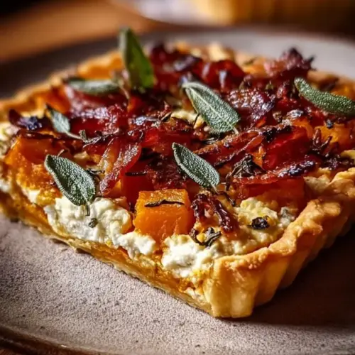 A comforting tart featuring a savory blend of pumpkin, ricotta, caramelized onions, crispy bacon, and fresh sage, all in a buttery pie crust.