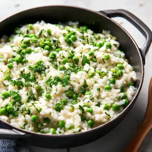 Feel free to experiment with flavor! Want a kick? Add a diced jalapeño or sprinkle some cayenne for heat. Thinking about dietary restrictions? Swap the Arborio rice for quinoa for a gluten-free option or use brown rice for added fiber. For a fall-inspired twist, try roasting butternut squash and mixing it in alongside the peas!