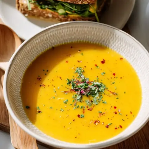 The taste is sweet yet earthy, with a creamy texture that feels luxurious on the palate. The addition of roasted garlic and onion creates a subtle richness, while the optional toppings – think crunchy pumpkin seeds or fresh herbs – introduce a delightful contrast. What’s unique about this soup is its versatility; it’s suitable for any occasion, whether you’re cozying up with a good book on a chilly night or impressing guests at your dinner party.