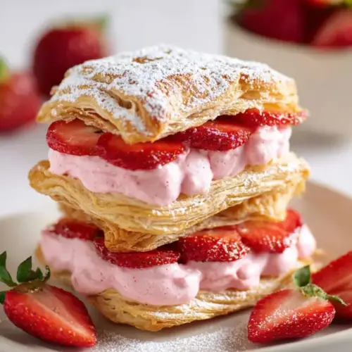 Strawberry Cheesecake Napoleons, often affectionately referred to as a “puff pastry dream,” are a delightful dessert that cleverly blends two favorite treats: the classic strawberry shortcake and a rich cheesecake. The origins can be traced back to the French term “Napoleon,” which refers to the many layers—much like the layers in this dessert. Each bite reveals a symphony of flaky pastry, creamy mousse, and fresh strawberries.