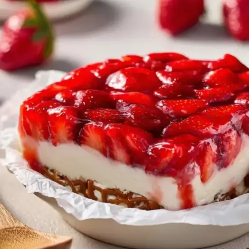 The texture is just as appealing: a crunchy pretzel crust serves as a sturdy base, topped by a creamy layer of whipped cream and cream cheese, and finished with luscious, fresh strawberries enveloped in a shimmering Jell-O artfully draped over the top. Every bite provides a delightful mix of crunch, creaminess, and fruity freshness that dances on your palate.